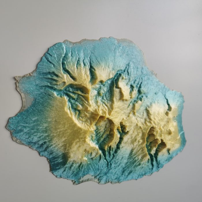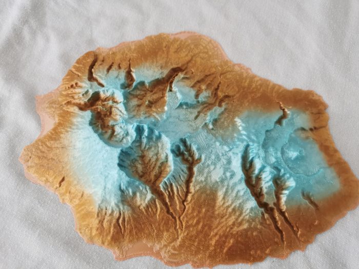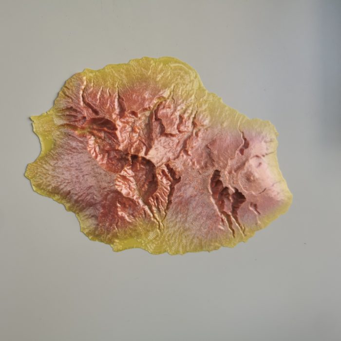 Magnet de La Réunion en relief avec dégradé de couleur.